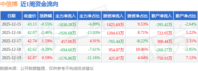 资金流向数据方面,本周中信博主力资金合计净流出4371.36万元,游资资金合计净流入3245.63万元,散户资金合计净流入1125.74万元。本周资金流向一览见下表: