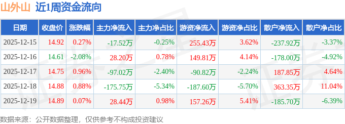 资金流向数据方面,本周山外山主力资金合计净流出233.65万元,游资资金合计净流入284.08万元,散户资金合计净流出50.43万元。本周资金流向一览见下表: