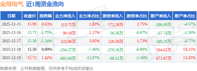 资金流向数据方面,本周金冠电气主力资金合计净流出463.26万元,游资资金合计净流出70.15万元,散户资金合计净流入533.41万元。本周资金流向一览见下表: