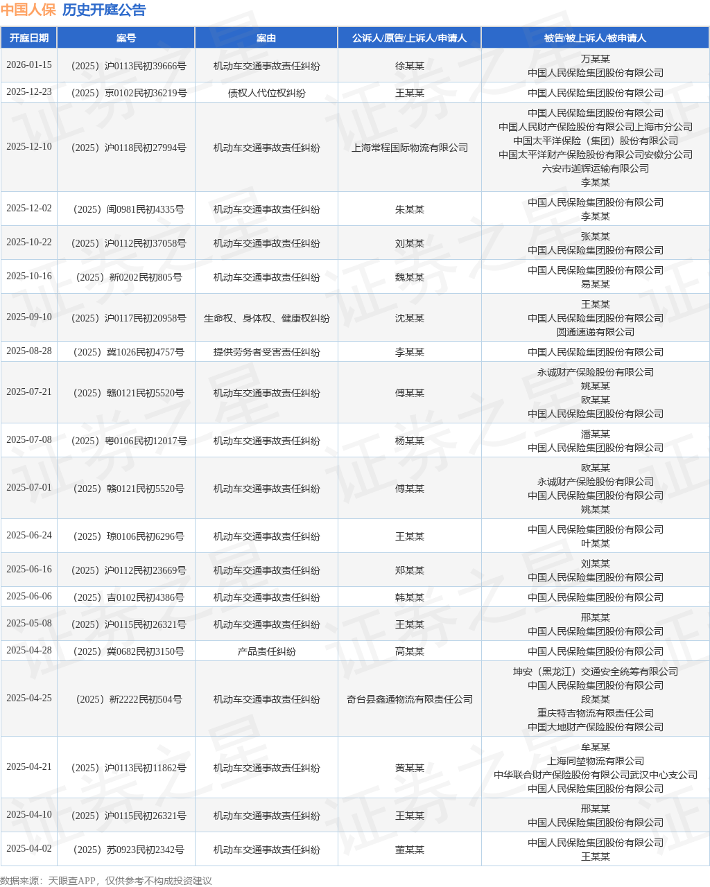 案号:(2025)京0102民初36219号根据统计,近一年内以中国人民保险集团股份有限公司为当事人的历史开庭公告有29则,其中案由为“机动车交通事故责任纠纷”的公告以19则居首,其次为“买卖合同纠纷”有3则,“交通事故”有1则。历史开庭公告(前20条)如下: