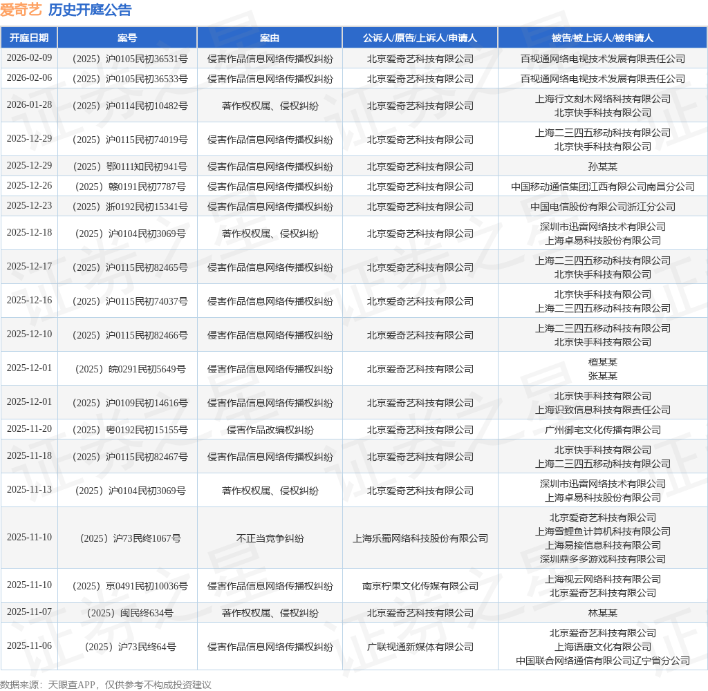 案号:(2025)浙0192民初15341号根据统计,近一年内以北京爱奇艺科技有限公司为当事人的历史开庭公告有304则,其中案由为“侵害作品信息网络传播权纠纷”的公告以232则居首,其次为“著作权权属、侵权纠纷”有17则,“不正当竞争纠纷”有15则。历史开庭公告(前20条)如下: