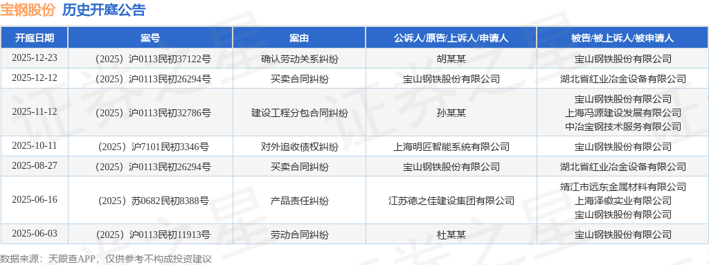 根据统计,近一年内以宝山钢铁股份有限公司为当事人的历史开庭公告有7则,其中案由为“买卖合同纠纷”的公告以2则居首,其次为“产品责任纠纷”有1则,“劳动合同纠纷”有1则。历史开庭公告如下: