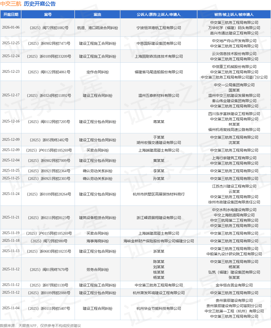 案号:(2025)闽0122民初4861号根据统计,近一年内以中交第三航务工程局有限公司为当事人的历史开庭公告有150则,其中案由为“建设工程分包合同纠纷”的公告以27则居首,其次为“建设工程施工合同纠纷”有26则,“买卖合同纠纷”有19则。历史开庭公告(前20条)如下: