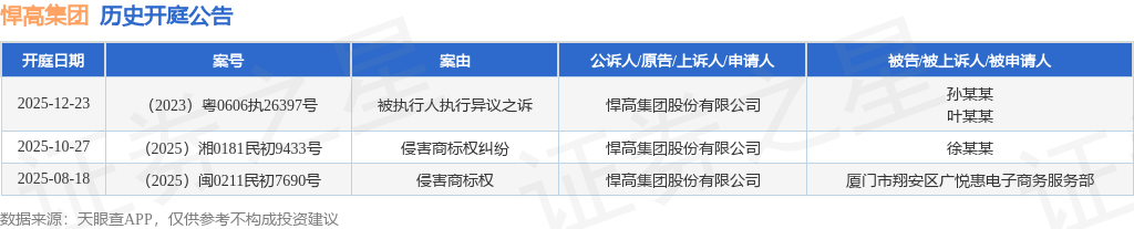 案号:(2023)粤0606执26397号根据统计,近一年内以悍高集团股份有限公司为当事人的历史开庭公告有3则,其中案由为“侵害商标权”的公告以1则居首,其次为“侵害商标权纠纷”有1则,“被执行人执行异议之诉”有1则。历史开庭公告如下: