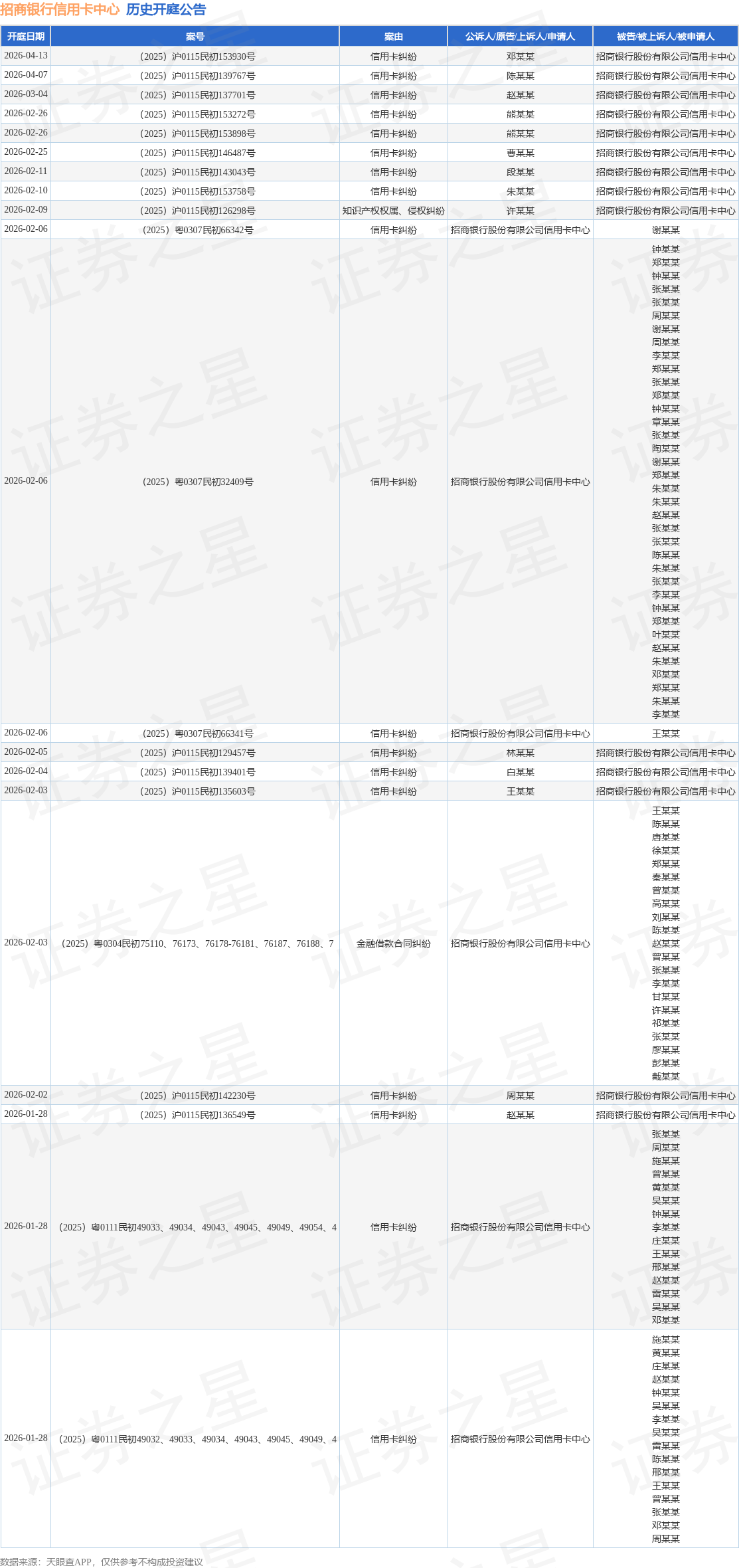 案号:(2025)川1102民初5236号根据统计,近一年内以招商银行股份有限公司信用卡中心为当事人的历史开庭公告有12339则,其中案由为“信用卡纠纷”的公告以9922则居首,其次为“金融借款合同纠纷”有2287则,“小额借款合同纠纷”有30则。历史开庭公告(前20条)如下: