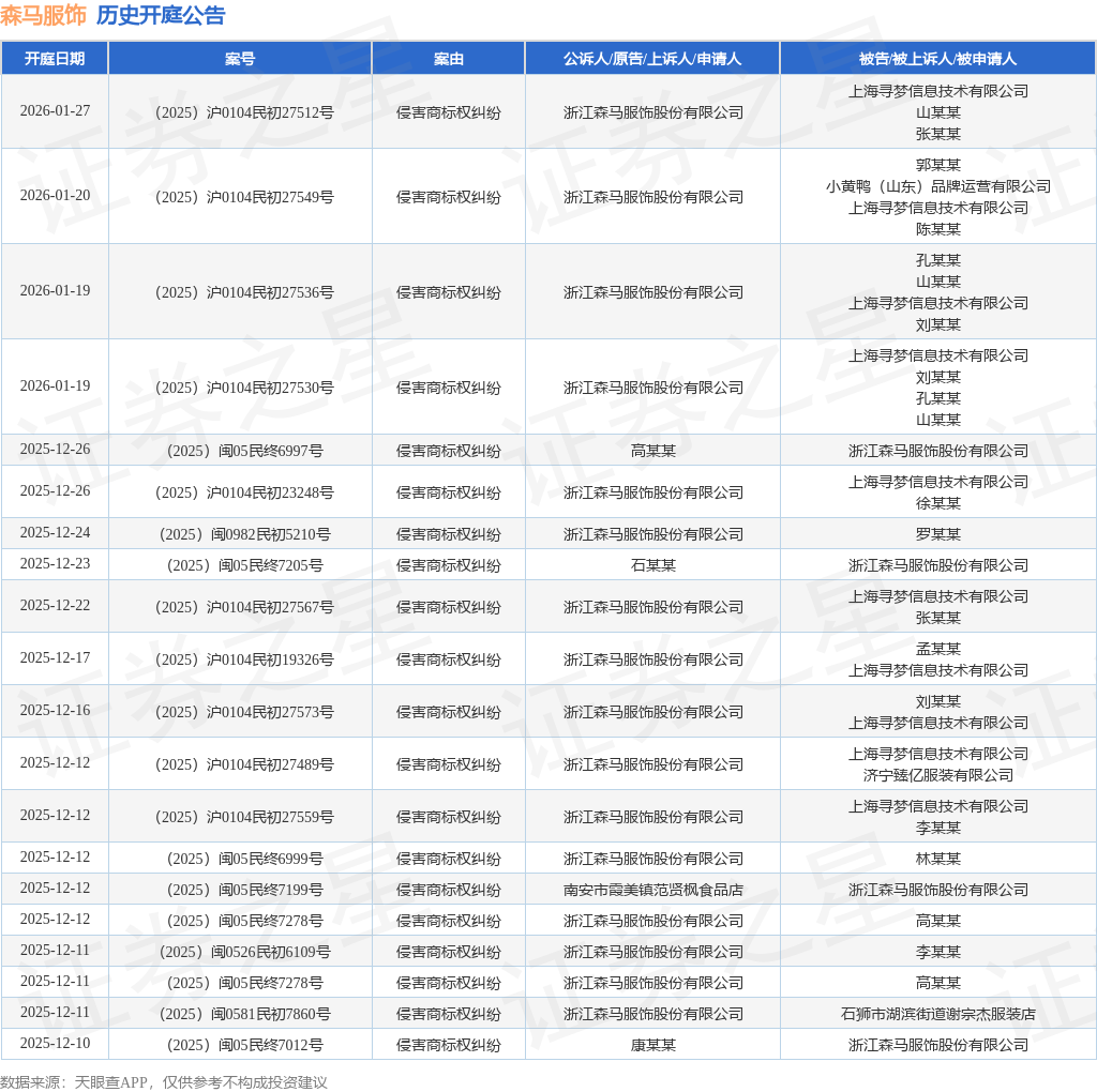 案号:(2025)闽05民终7205号根据统计,近一年内以浙江森马服饰股份有限公司为当事人的历史开庭公告有68则,其中案由为“侵害商标权纠纷”的公告以61则居首,其次为“侵害商标权”有5则,“侵害商标权及不正当竞争纠纷”有1则。历史开庭公告(前20条)如下: