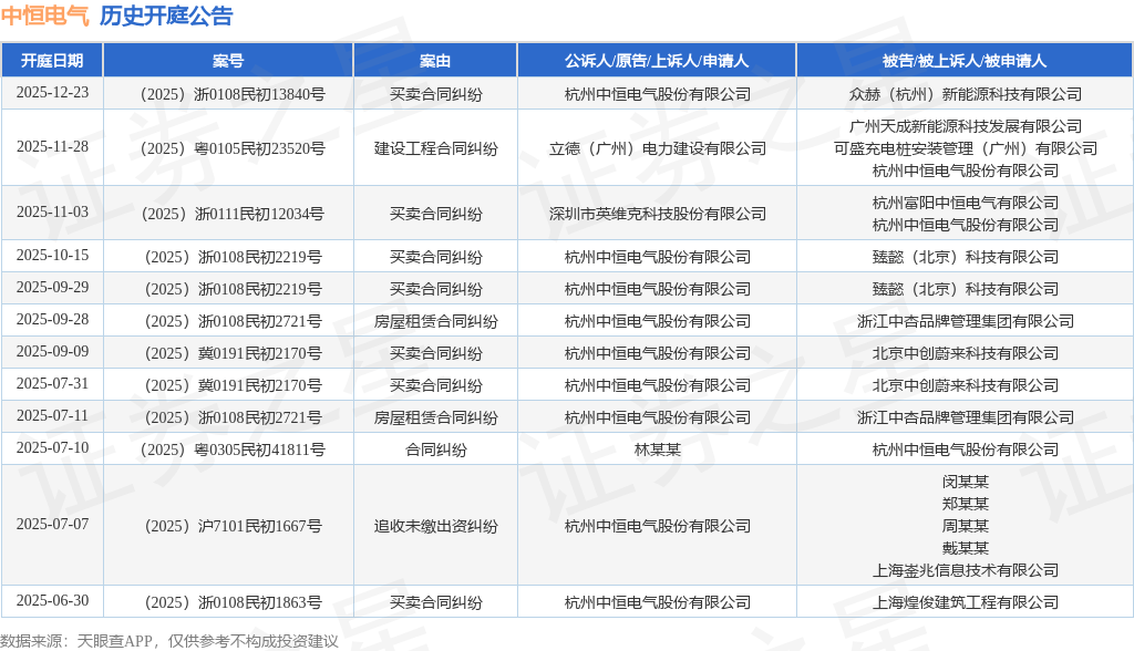 案号:(2025)浙0108民初13840号根据统计,近一年内以杭州中恒电气股份有限公司为当事人的历史开庭公告有12则,其中案由为“买卖合同纠纷”的公告以7则居首,其次为“房屋租赁合同纠纷”有2则,“合同纠纷”有1则。历史开庭公告如下: