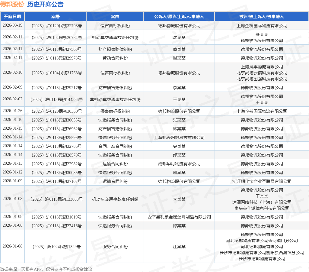 案号:(2025)沪0118民初27174号根据统计,近一年内以德邦物流股份有限公司为当事人的历史开庭公告有386则,其中案由为“快递服务合同纠纷”的公告以113则居首,其次为“运输合同纠纷”有77则,“劳动争议”有29则。历史开庭公告(前20条)如下: