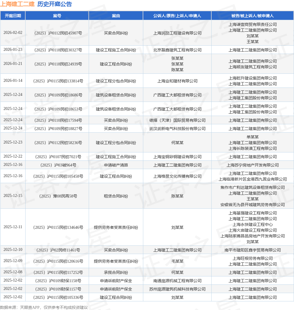 案号:(2025)沪0107民初7021号根据统计,近一年内以上海建工二建集团有限公司为当事人的历史开庭公告有252则,其中案由为“建设工程施工合同纠纷”的公告以69则居首,其次为“买卖合同纠纷”有29则,“建设工程合同纠纷”有26则。历史开庭公告(前20条)如下:
