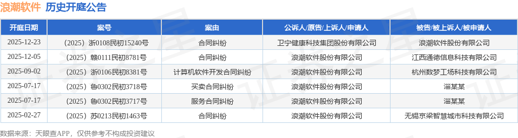 根据统计,近一年内以浪潮软件股份有限公司为当事人的历史开庭公告有6则,其中案由为“合同纠纷”的公告以3则居首,其次为“买卖合同纠纷”有1则,“服务合同纠纷”有1则。历史开庭公告如下: