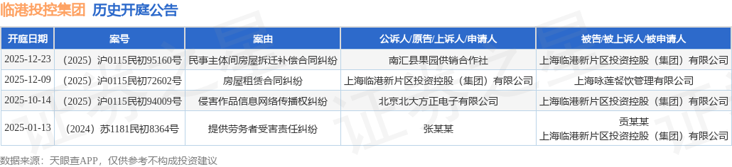 案号:(2025)沪0115民初95160号根据统计,近一年内以上海临港新片区投资控股(集团)有限公司为当事人的历史开庭公告有4则,其中案由为“侵害作品信息网络传播权纠纷”的公告以1则居首,其次为“房屋租赁合同纠纷”有1则,“提供劳务者受害责任纠纷”有1则。历史开庭公告如下: