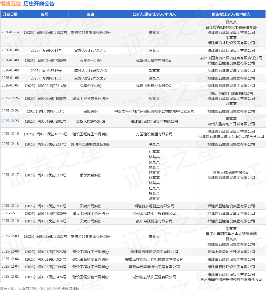 案号:(2025)闽05民终7313号根据统计,近一年内以福建省五建建设集团有限公司为当事人的历史开庭公告有120则,其中案由为“建设工程施工合同纠纷”的公告以40则居首,其次为“债权人撤销权纠纷”有23则,“建设工程分包合同纠纷”有16则。历史开庭公告(前20条)如下:
