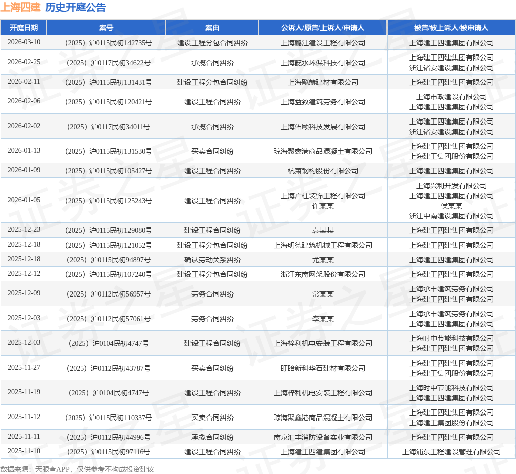 案号:(2025)沪0115民初129080号根据统计,近一年内以上海建工四建集团有限公司为当事人的历史开庭公告有131则,其中案由为“买卖合同纠纷”的公告以27则居首,其次为“建设工程分包合同纠纷”有25则,“建设工程合同纠纷”有14则。历史开庭公告(前20条)如下: