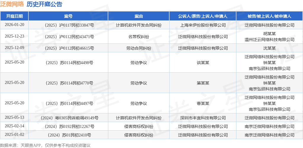 案号:(2025)沪0112民初43471号根据统计,近一年内以泛微网络科技股份有限公司为当事人的历史开庭公告有9则,其中案由为“劳动争议”的公告以3则居首,其次为“侵害商标权纠纷”有2则,“计算机软件开发合同纠纷”有2则。历史开庭公告如下: