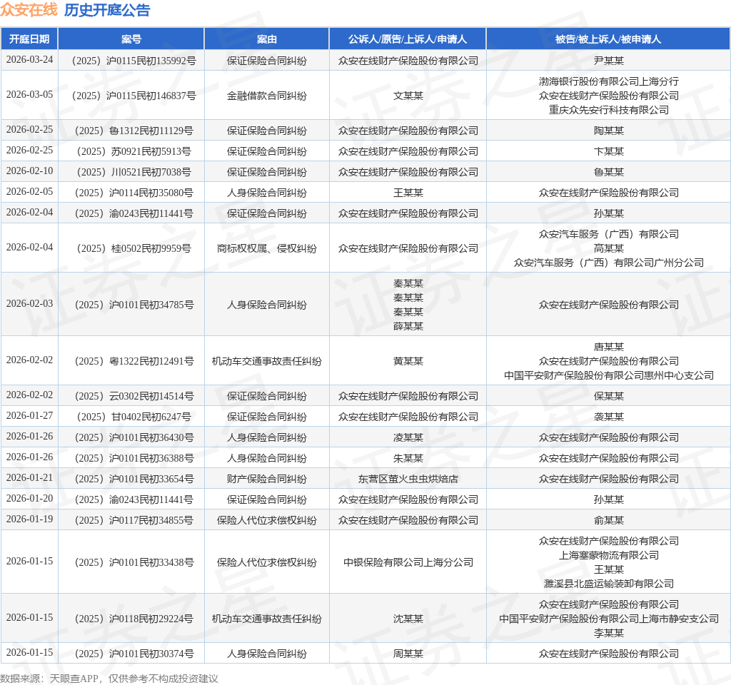 案号:(2025)浙0683民初11955号根据统计,近一年内以众安在线财产保险股份有限公司为当事人的历史开庭公告有4569则,其中案由为“保证保险合同纠纷”的公告以2973则居首,其次为“人身保险合同纠纷”有617则,“保险人代位求偿权纠纷”有289则。历史开庭公告(前20条)如下: