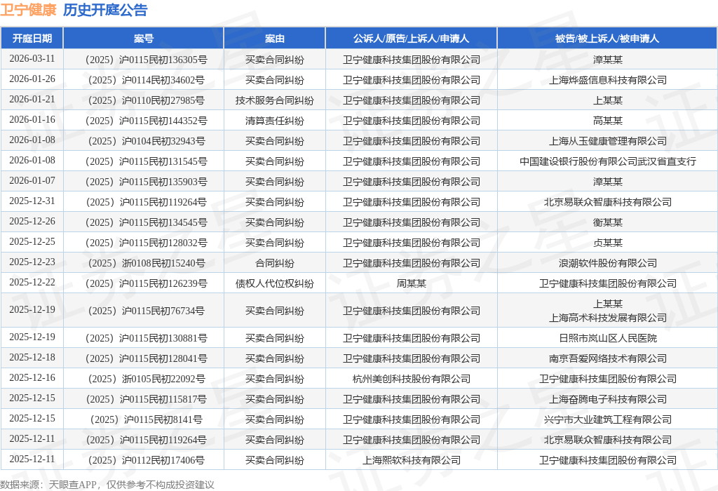 案号:(2025)浙0108民初15240号根据统计,近一年内以卫宁健康科技集团股份有限公司为当事人的历史开庭公告有94则,其中案由为“买卖合同纠纷”的公告以57则居首,其次为“劳动合同纠纷”有12则,“技术服务合同纠纷”有5则。历史开庭公告(前20条)如下: