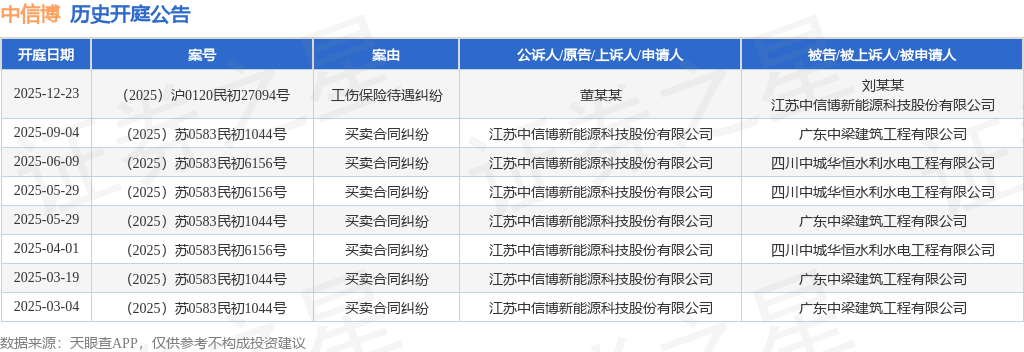 案号:(2025)沪0120民初27094号根据统计,近一年内以江苏中信博新能源科技股份有限公司为当事人的历史开庭公告有8则,其中案由为“买卖合同纠纷”的公告以7则居首,其次为“工伤保险待遇纠纷”有1则。历史开庭公告如下: