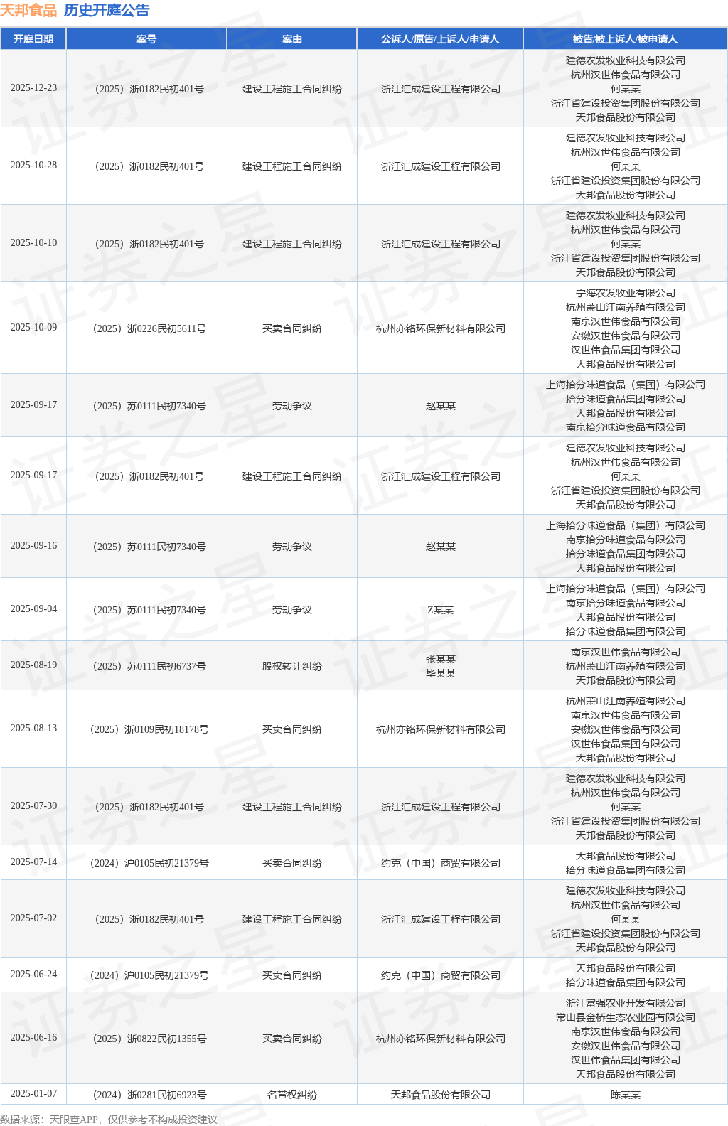 根据统计,近一年内以天邦食品股份有限公司为当事人的历史开庭公告有16则,其中案由为“建设工程施工合同纠纷”的公告以6则居首,其次为“买卖合同纠纷”有5则,“劳动争议”有3则。历史开庭公告如下: