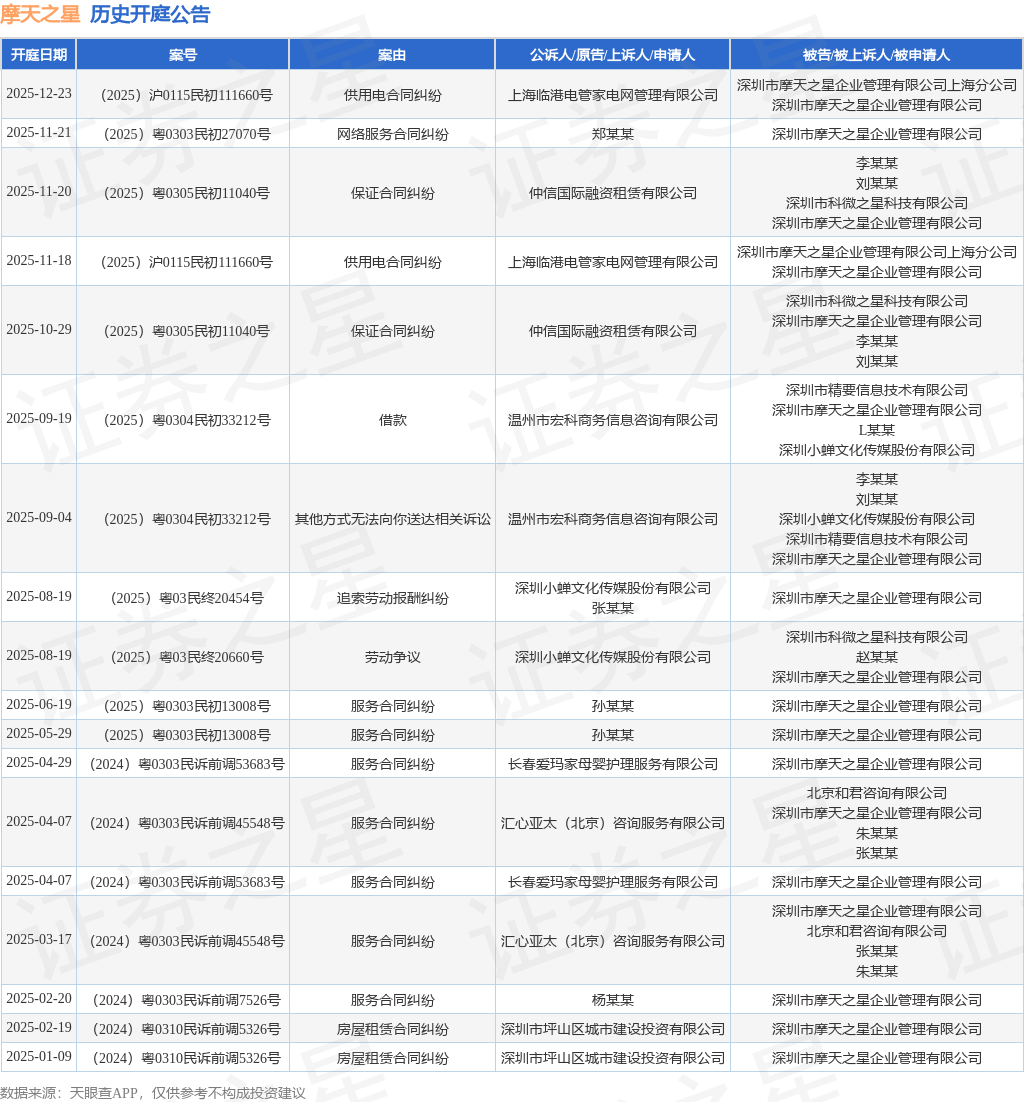 案号:(2025)沪0115民初111660号根据统计,近一年内以深圳市摩天之星企业管理有限公司为当事人的历史开庭公告有18则,其中案由为“服务合同纠纷”的公告以7则居首,其次为“供用电合同纠纷”有2则,“保证合同纠纷”有2则。历史开庭公告如下: