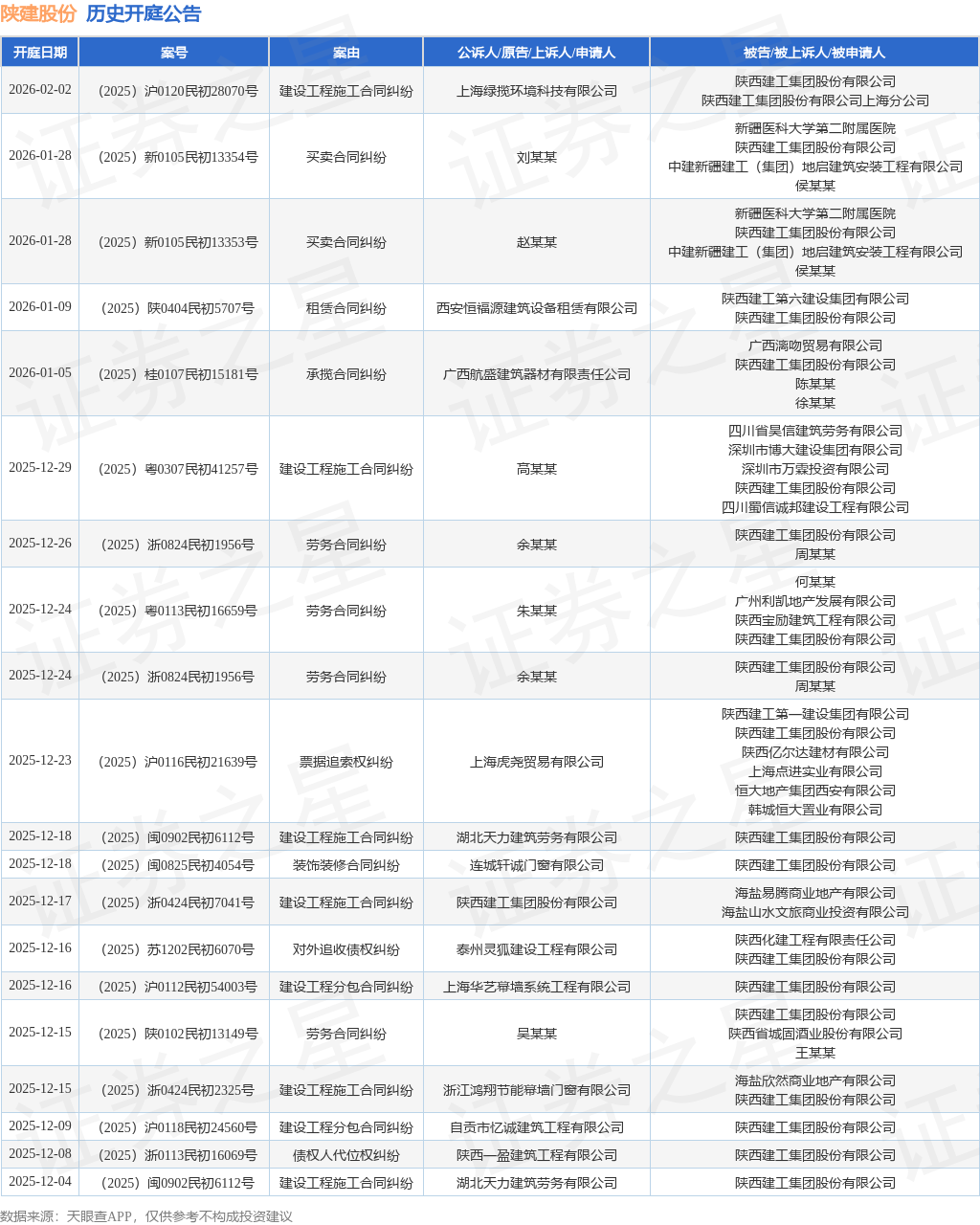 案号:(2025)沪0116民初21639号根据统计,近一年内以陕西建工集团股份有限公司为当事人的历史开庭公告有255则,其中案由为“建设工程施工合同纠纷”的公告以62则居首,其次为“买卖合同纠纷”有47则,“建设工程分包合同纠纷”有31则。历史开庭公告(前20条)如下: