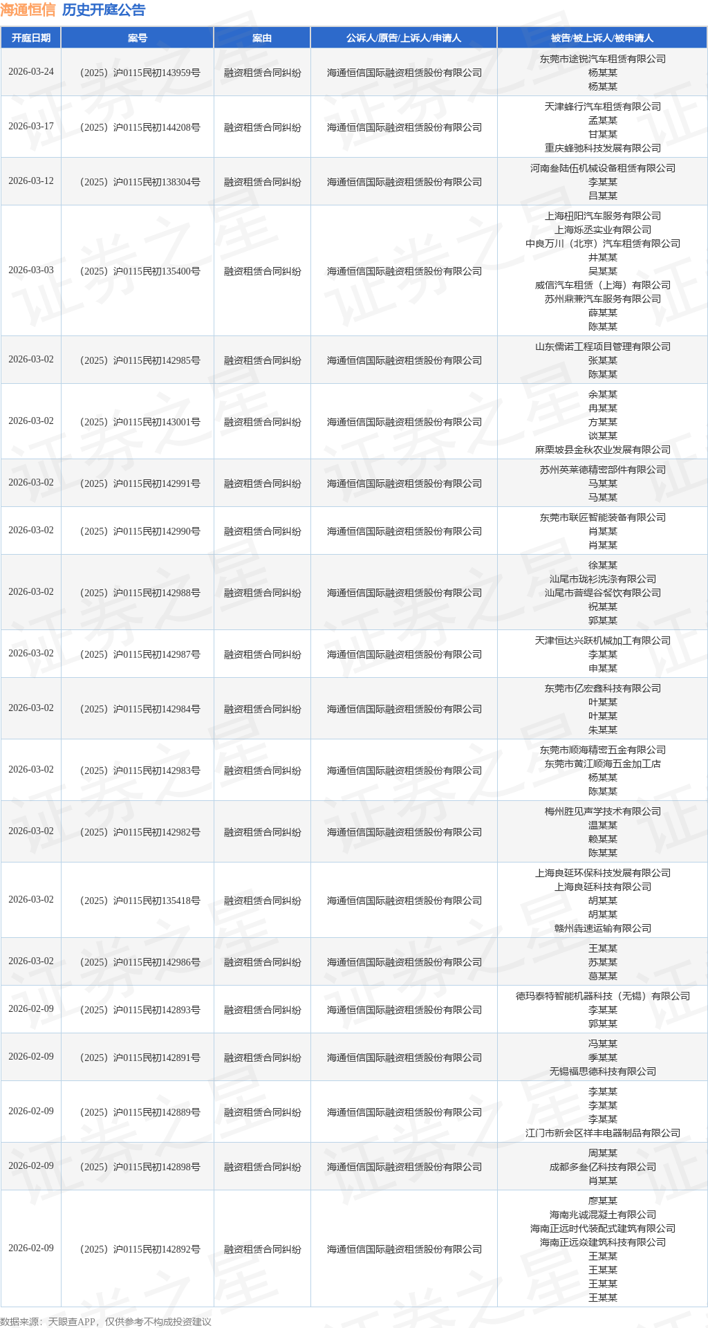 案号:(2025)沪74民终1760号根据统计,近一年内以海通恒信国际融资租赁股份有限公司为当事人的历史开庭公告有1062则,其中案由为“融资租赁合同纠纷”的公告以966则居首,其次为“申请实现担保物权”有28则,“合同纠纷”有18则。历史开庭公告(前20条)如下: