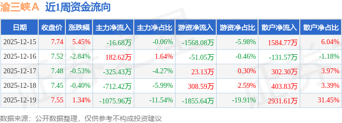 资金流向数据方面,本周渝三峡A主力资金合计净流出1947.88万元,游资资金合计净流出3143.06万元,散户资金合计净流入5090.93万元。本周资金流向一览见下表: