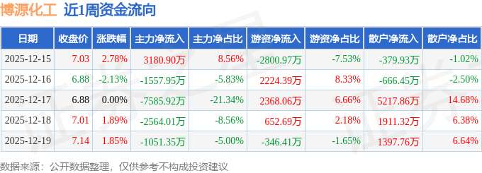 资金流向数据方面,本周博源化工主力资金合计净流出9578.32万元,游资资金合计净流入2097.76万元,散户资金合计净流入7480.55万元。本周资金流向一览见下表: