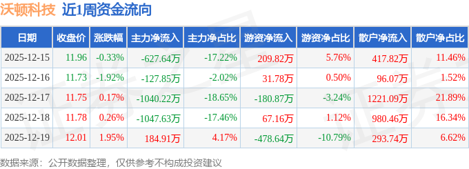 资金流向数据方面,本周沃顿科技主力资金合计净流出2658.44万元,游资资金合计净流出350.74万元,散户资金合计净流入3009.18万元。本周资金流向一览见下表: