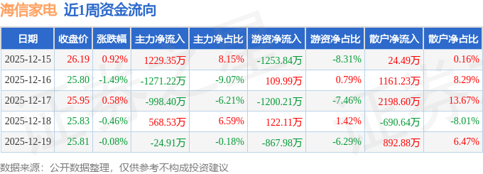 沪深股通持股方面,截止2025年12月19日收盘,海信家电深股通持股数为5725.18万股,占流通股比为628.0%。