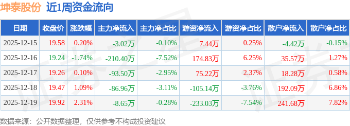 资金流向数据方面,本周坤泰股份主力资金合计净流出402.53万元,游资资金合计净流出80.69万元,散户资金合计净流入483.21万元。本周资金流向一览见下表: