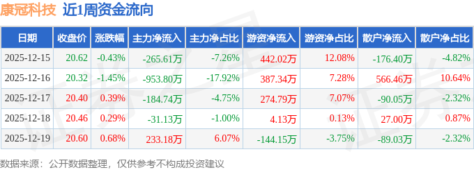 资金流向数据方面,本周康冠科技主力资金合计净流出1202.11万元,游资资金合计净流入964.14万元,散户资金合计净流入237.97万元。本周资金流向一览见下表: