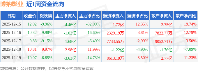 资金流向数据方面,本周博纳影业主力资金合计净流出7.81亿元,游资资金合计净流入2.37亿元,散户资金合计净流入5.44亿元。本周资金流向一览见下表: