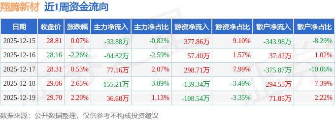 资金流向数据方面,本周翔腾新材主力资金合计净流出170.07万元,游资资金合计净流入486.09万元,散户资金合计净流出316.02万元。本周资金流向一览见下表: