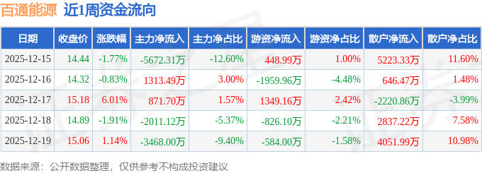资金流向数据方面,本周百通能源主力资金合计净流出8966.25万元,游资资金合计净流出1571.9万元,散户资金合计净流入1.05亿元。本周资金流向一览见下表: