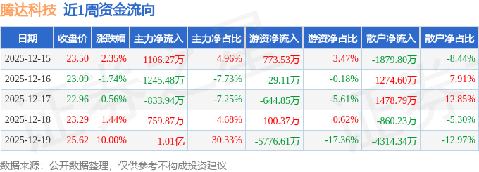 资金流向数据方面,本周腾达科技主力资金合计净流入9877.66万元,游资资金合计净流出5576.68万元,散户资金合计净流出4300.98万元。本周资金流向一览见下表: