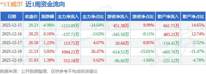 资金流向数据方面,本周*ST威尔主力资金合计净流入259.34万元,游资资金合计净流出574.64万元,散户资金合计净流入315.29万元。本周资金流向一览见下表: