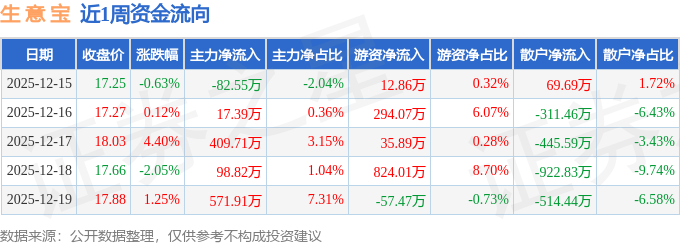 资金流向数据方面,本周生 意 宝主力资金合计净流入1015.28万元,游资资金合计净流入1109.36万元,散户资金合计净流出2124.64万元。本周资金流向一览见下表: