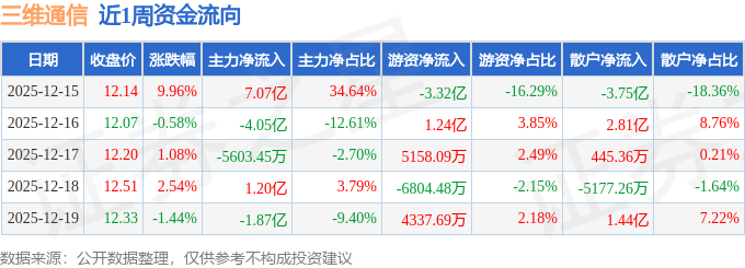 资金流向数据方面,本周三维通信主力资金合计净流入1.78亿元,游资资金合计净流出1.82亿元,散户资金合计净流入334.71万元。本周资金流向一览见下表: