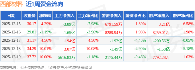 资金流向数据方面,本周西部材料主力资金合计净流出1.09亿元,游资资金合计净流出2.12亿元,散户资金合计净流入3.21亿元。本周资金流向一览见下表: