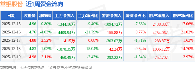 资金流向数据方面,本周常铝股份主力资金合计净流出8078.79万元,游资资金合计净流出1491.84万元,散户资金合计净流入9570.63万元。本周资金流向一览见下表: