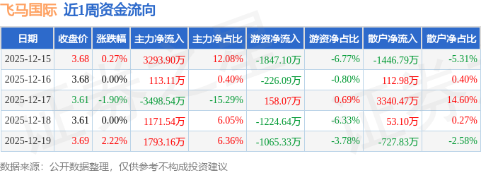 资金流向数据方面,本周飞马国际主力资金合计净流入2873.17万元,游资资金合计净流出4205.09万元,散户资金合计净流入1331.92万元。本周资金流向一览见下表: