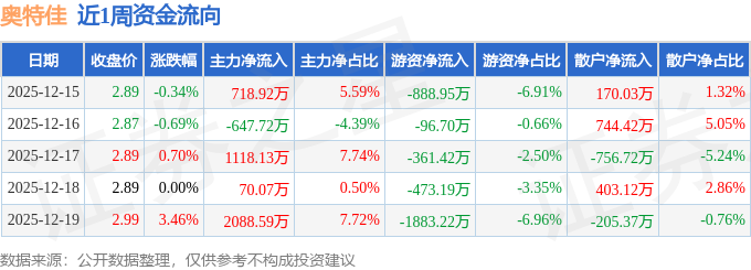 资金流向数据方面,本周奥特佳主力资金合计净流入3347.99万元,游资资金合计净流出3703.48万元,散户资金合计净流入355.48万元。本周资金流向一览见下表: