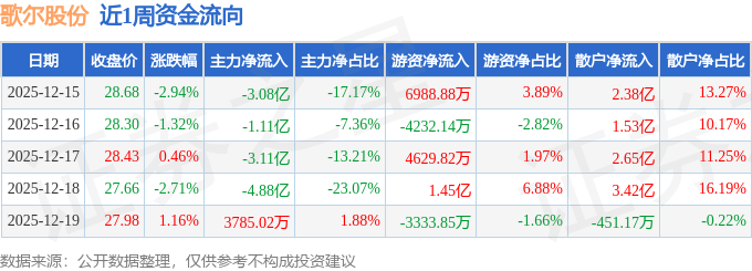 资金流向数据方面,本周歌尔股份主力资金合计净流出11.8亿元,游资资金合计净流入1.86亿元,散户资金合计净流入9.94亿元。本周资金流向一览见下表: