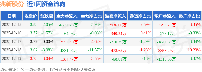 资金流向数据方面,本周兆新股份主力资金合计净流出7190.41万元,游资资金合计净流入2975.55万元,散户资金合计净流入4214.86万元。本周资金流向一览见下表: