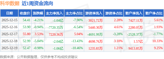 资金流向数据方面,本周科华数据主力资金合计净流出4.2亿元,游资资金合计净流入9704.63万元,散户资金合计净流入3.23亿元。本周资金流向一览见下表:
