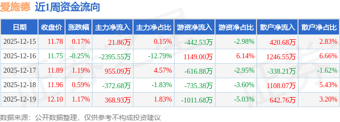 资金流向数据方面,本周爱施德主力资金合计净流出1422.36万元,游资资金合计净流出1657.47万元,散户资金合计净流入3079.83万元。本周资金流向一览见下表: