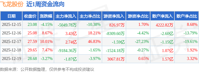 资金流向数据方面,本周飞龙股份主力资金合计净流入2.87亿元,游资资金合计净流出2.19亿元,散户资金合计净流出6821.75万元。本周资金流向一览见下表: