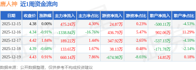 资金流向数据方面,本周唐人神主力资金合计净流入119.39万元,游资资金合计净流入172.72万元,散户资金合计净流出292.11万元。本周资金流向一览见下表: