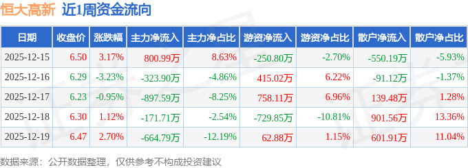 资金流向数据方面,本周恒大高新主力资金合计净流出1257.01万元,游资资金合计净流入255.37万元,散户资金合计净流入1001.64万元。本周资金流向一览见下表: