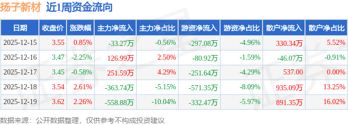 资金流向数据方面,本周扬子新材主力资金合计净流出577.31万元,游资资金合计净流出1533.46万元,散户资金合计净流入2110.77万元。本周资金流向一览见下表: